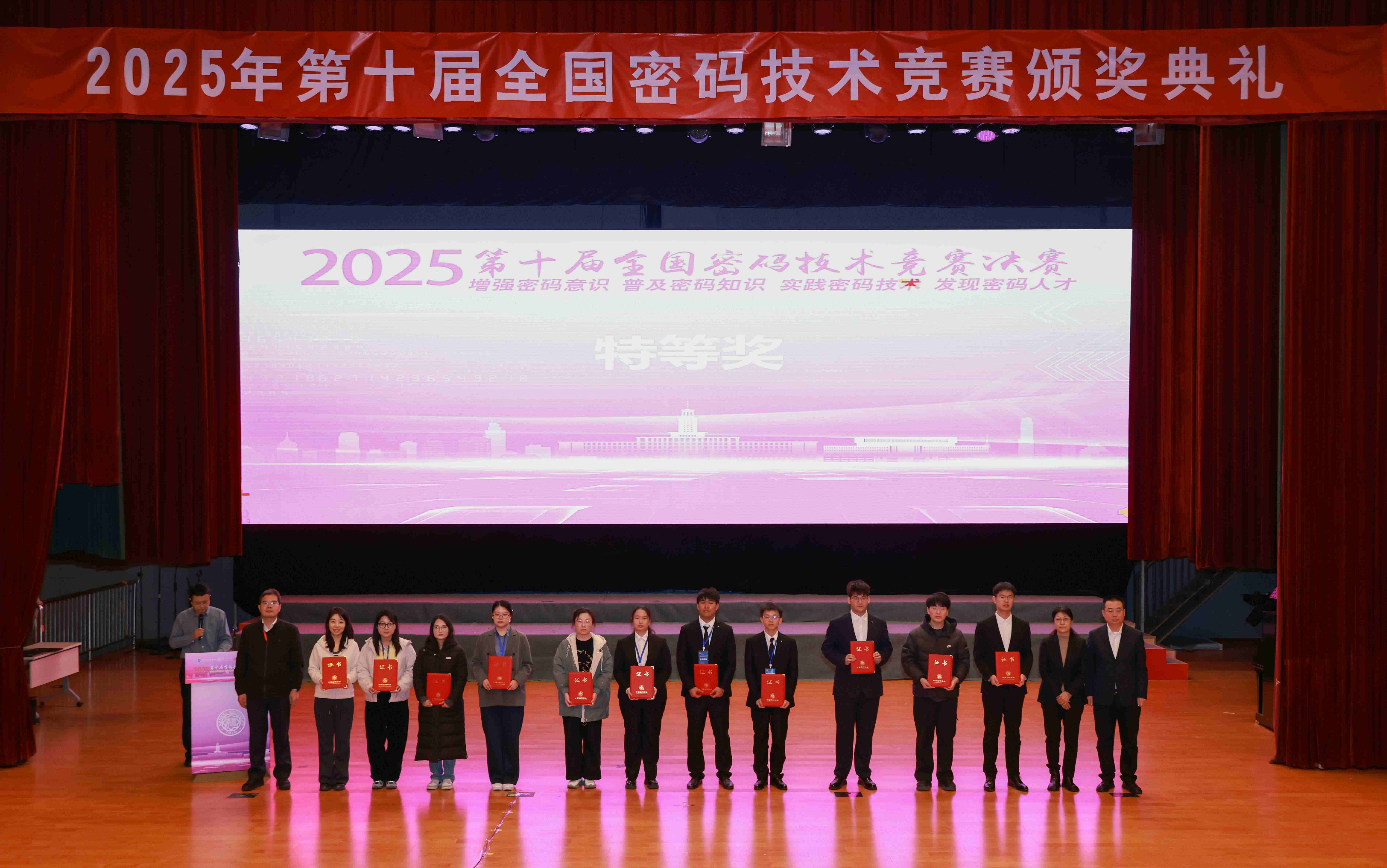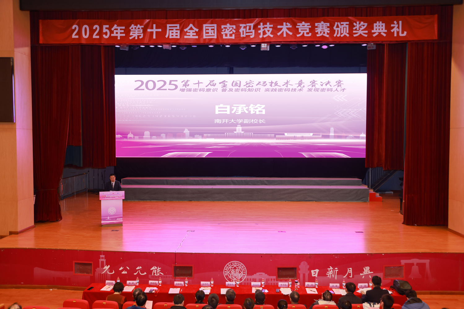 南开大学副校长白承铭、天津市国家密码管理局局长丛为民、华为中国区首席网络安全与隐私保护官冯运波出席颁奖典礼并致辞,中国密码学会副理事长兼秘书长谢永泉作总结讲话,中国密码学会常务理事、教育与科普工作委员会主任委员李子臣主持特等奖评审,中国密码学会理事、教育与科普工作委员会副主任委员辛阳宣布获奖名单,南开大学计算机学院、密码与网络空间安全学院负责人主持颁奖典礼。